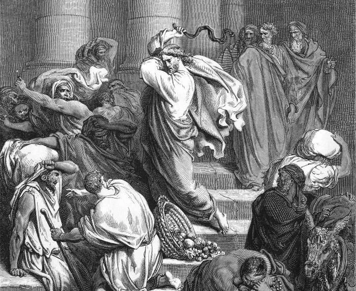 Jesus entered the temple area and drove out all those engaged in selling and buying there. He overturned the tables of the money changers and the seats of those who were selling doves.